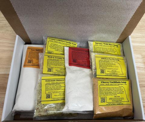 A brand new gift box with some of our favorite top sellers! Granny's Chicken Noodle Soup, Cheesy Enchilada Soup, Chicken Pot Pie Soup, Rich n' Creamy Stroganoff Soup, Savory Wild Rice Soup' Homemade Chicken n' Rice Soup' Easy Buttery Beer Bread' and Cinnamon Swirl Quick Bread
